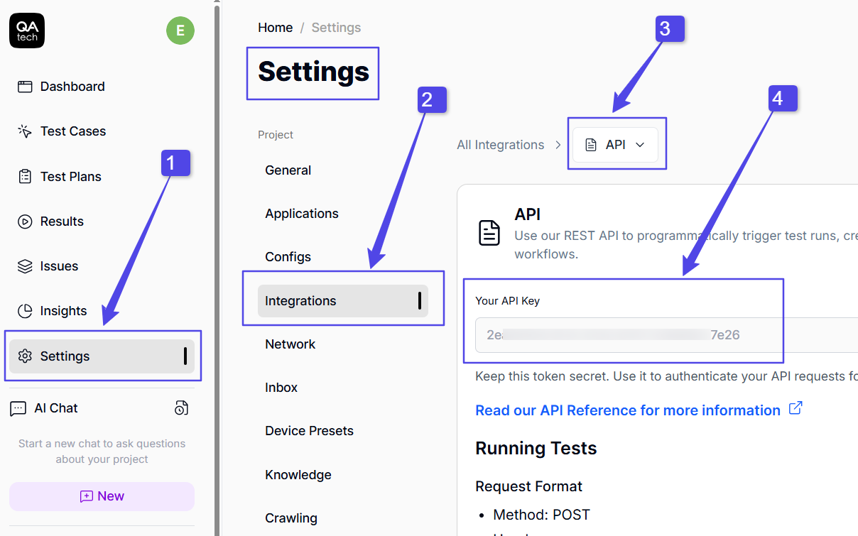 To get the token, go to Integrations within Settings. Then, click API and copy the API key.