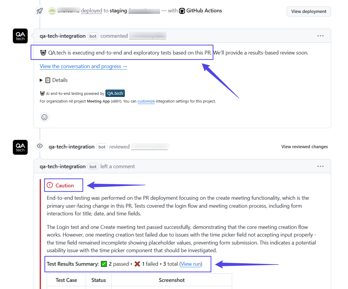 QA.tech supports PR reviews through GitHub App. The AI agent automatically reviews every pull request opened on a specified branch. It analyzes code diff to find user-facing changes, and it inspects preview deployments to test new or modified user paths.