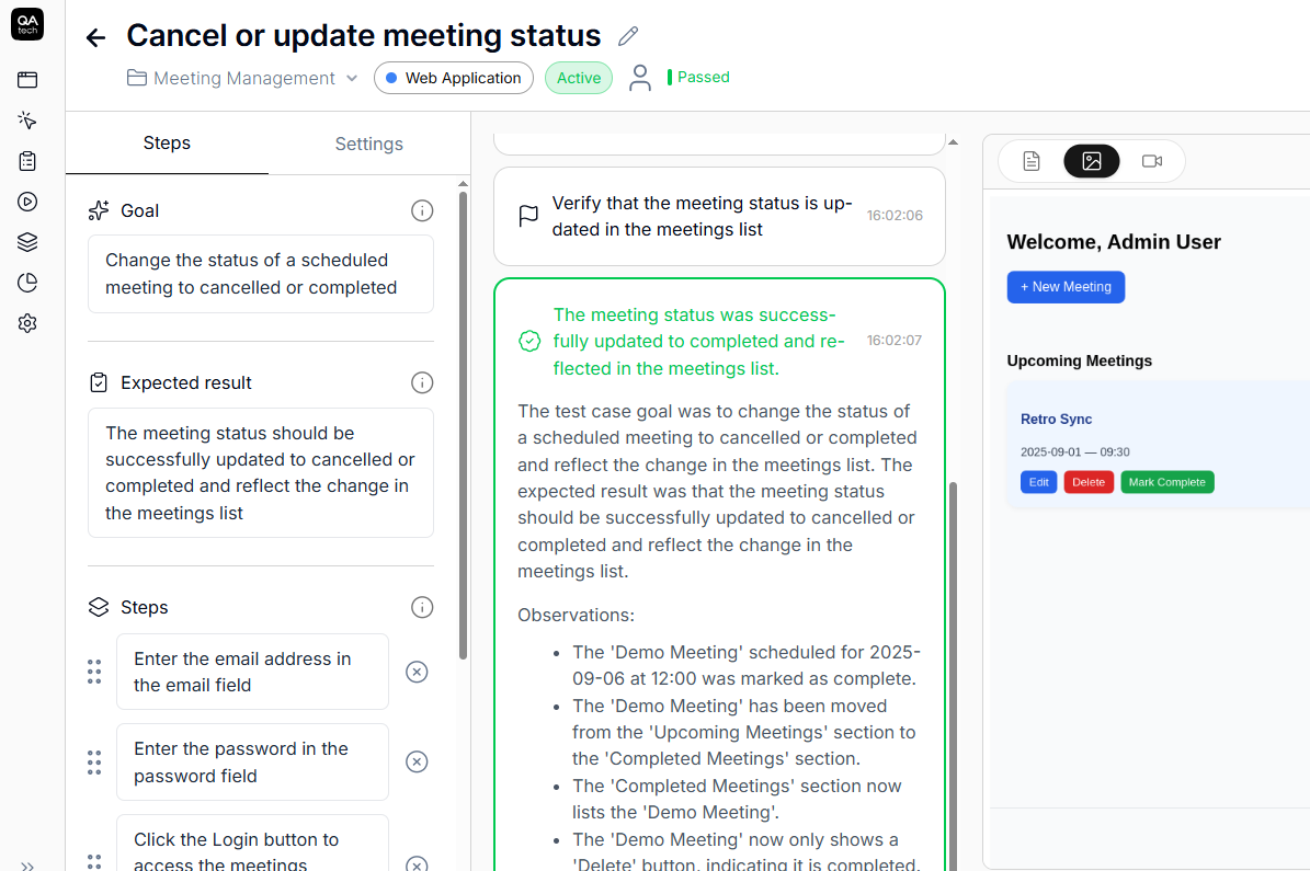 Agentic testing with QA.tech involves interacting with an app just like a real user would. Agents test against goals such as onboarding, filling out forms, and completing checkout. They extract user flows from your UI and group them into test cases.
