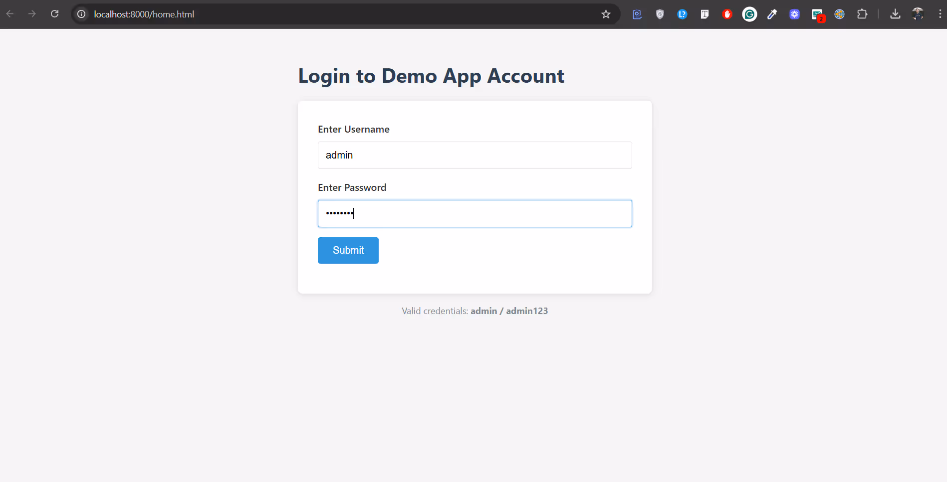 python serve_app.pyFinally, your page will be live at http://localhost:8000, displaying a login form with valid credentials.