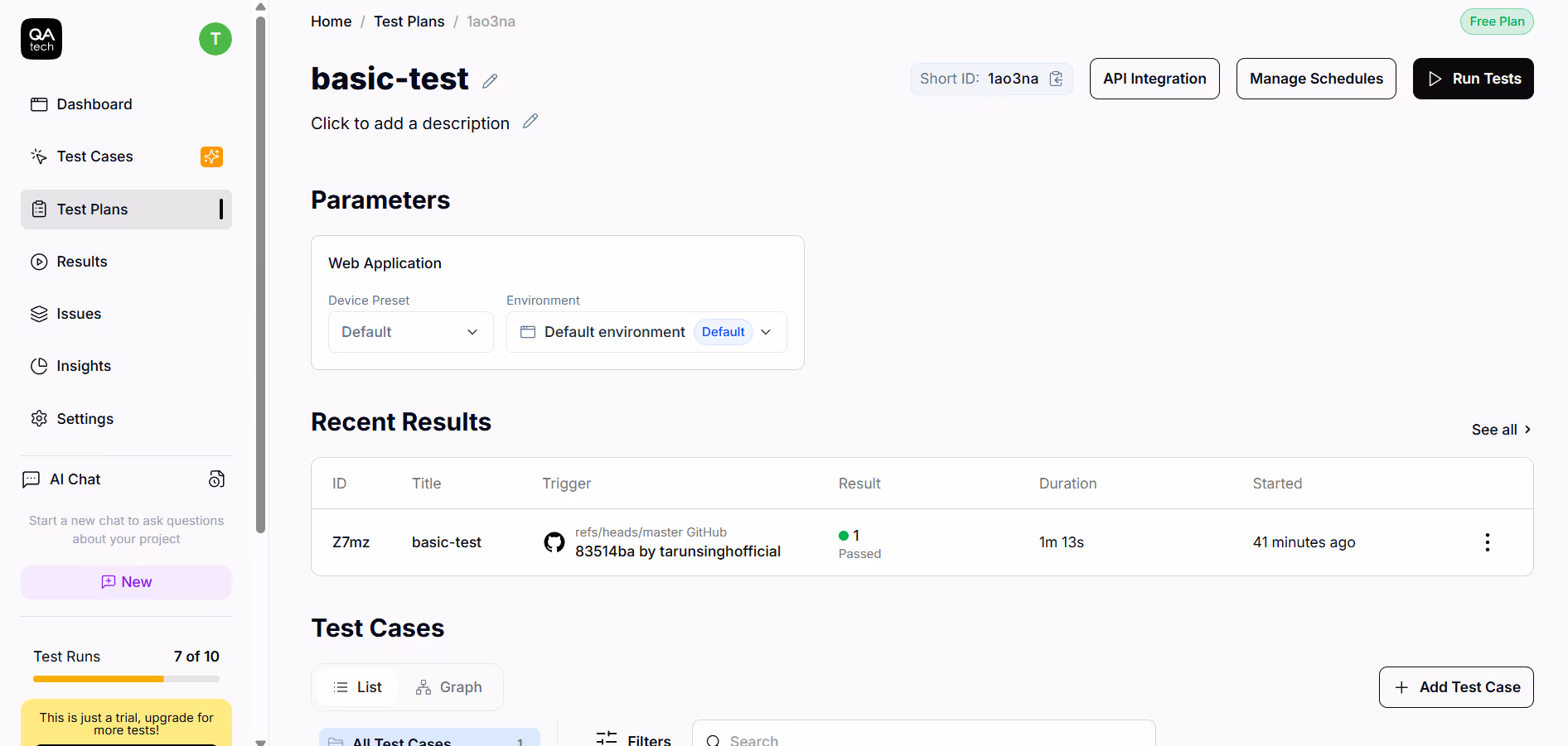 Ready to transform your QA process and boost your development speed? Start your free trial today and connect your GitHub repository to see the power of AI testing in action.