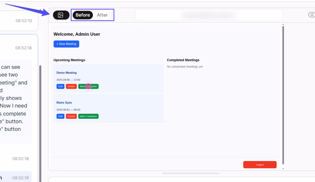 In the test below, I specified that the expected result was for the meeting to be marked complete and moved to another column, with no weird UI overlays. The agent verified just that at the end of the test while checking for other UI bugs, too.
