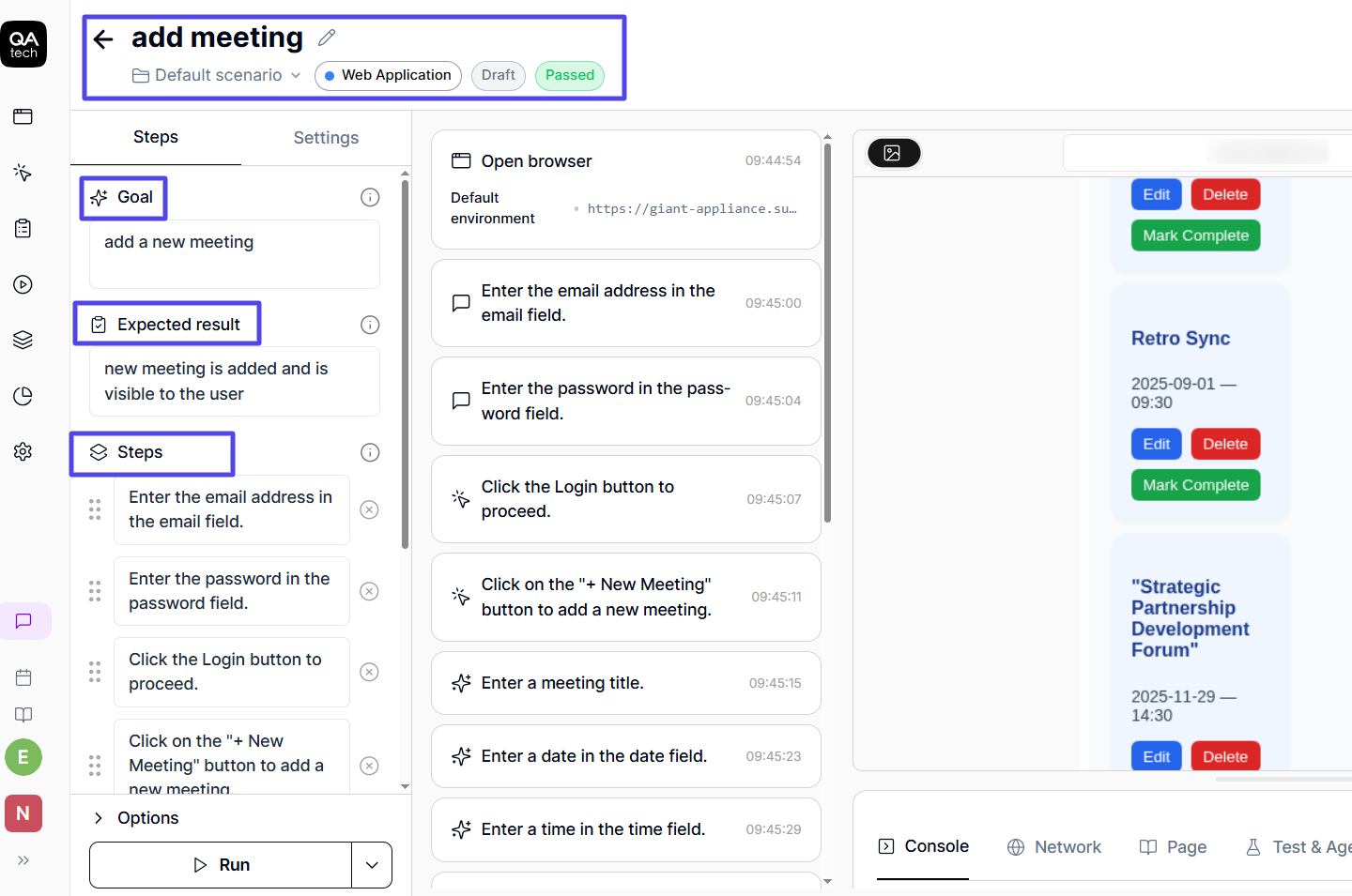 For example, in the screenshot below, the goal was to add a new meeting. I also included some info in the expected result field, and the agent tested the flow.