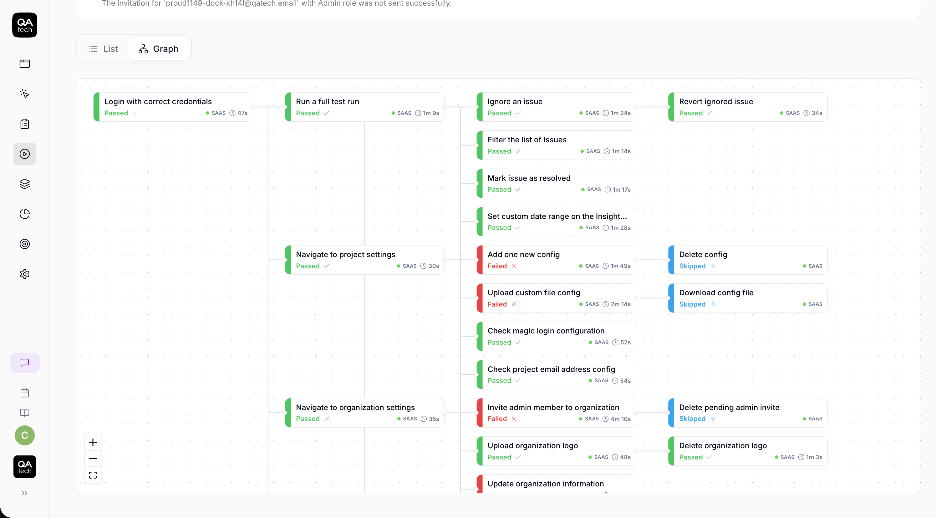 However, QA.tech has a knowledge graph that tracks test dependencies. You can clearly see what steps and states are required before the next one. For instance, in the example below, a logged-in state is the first condition, and the test runs only if the previous step passes.