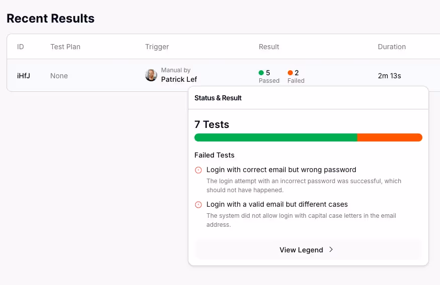 - Hover to View Details: Quickly see why a test failed by hovering over the status in the test list.