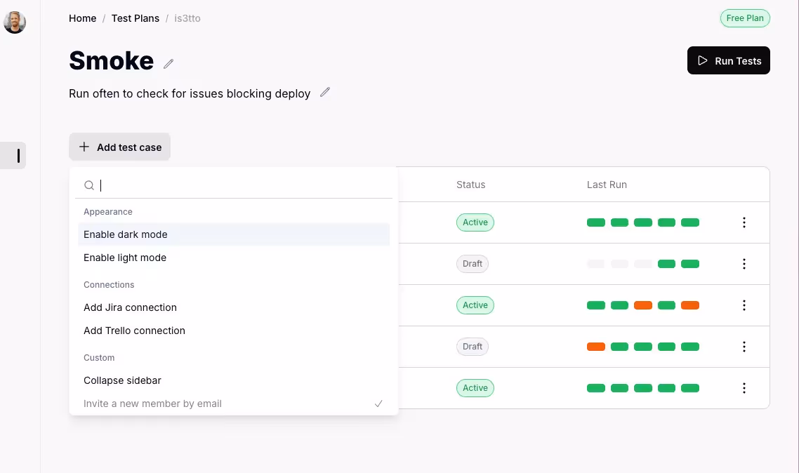 Test Plans are collections of test cases that you want to run together regularly. This feature provides flexibility in running tests through multiple methods: API triggers, scheduled runs, or manual execution through the UI.