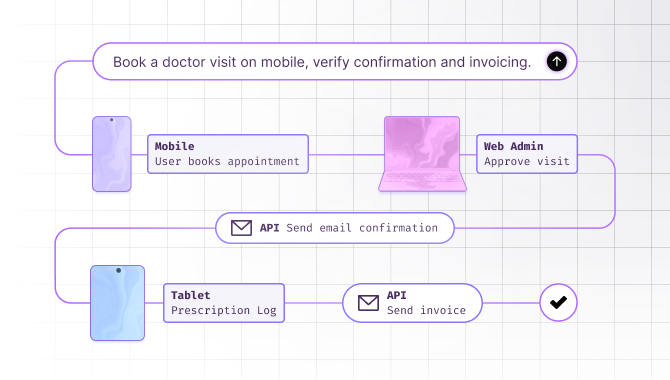 Use AI to test full E2E user journeys across web, mobile apps, and APIs. Catch bugs as early as PRs and CI β not days later in QA or production.