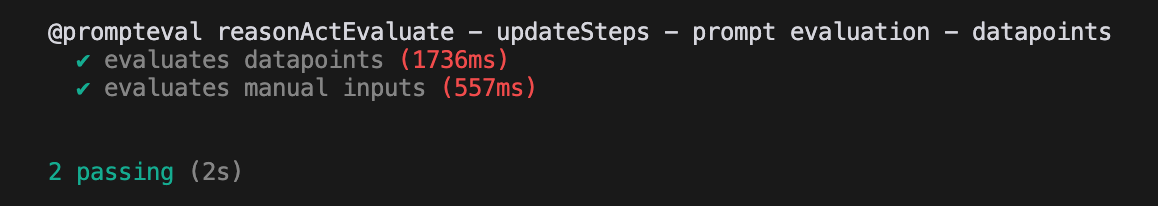 promptfoo can be used as a CLI, but our current primary use case is to run evaluations from test scripts. Let’s go through an example of how we evaluate tweaks to our agent’s test step update prompt.