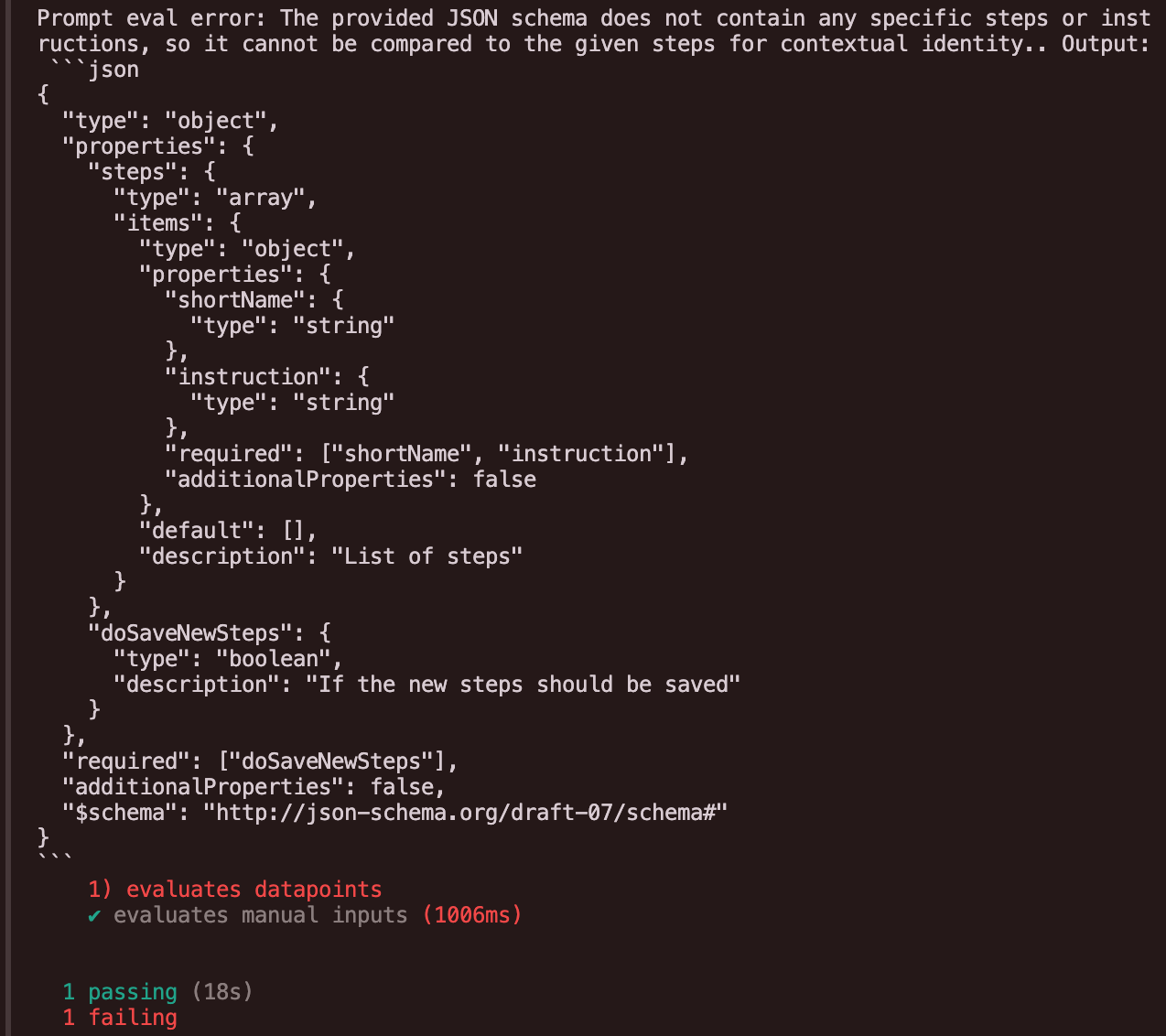 }Above, we prepare our UpdateStepInput type by splitting locked from unlocked steps (we might cover this in a future blog post) and deciding what prompt evaluation asserts we want to test for. If a set of asserts is provided by the caller, we use that. Otherwise, we use a default set of asserts.