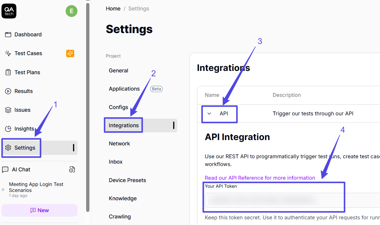 Click “Settings” in the side menu and select “Integrations.” Then click “API” and copy your secret token.