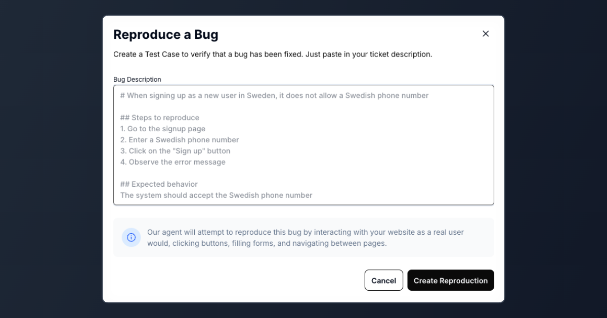 How It Works Simply describe the bug—like "Incorrect phone number in sign up doesn't give a validation message" or "No email when trying to reset password"—and let our AI take care of the rest.