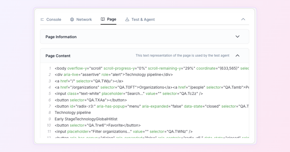 Debugging automated tests often involves understanding exactly what data the AI agent is processing. To simplify this, we've enhanced the tracer to show all the data the agent receives—including the current page and agent context - providing clearer visibility into what's happening during test execution.