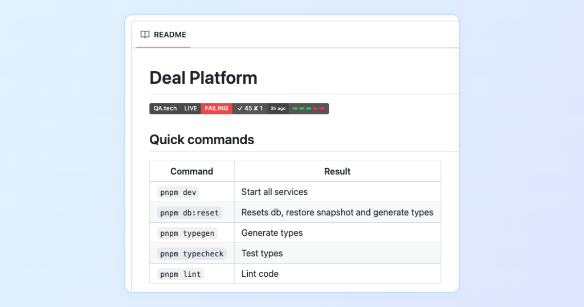 Now you can add a QA.tech status badge directly to your GitHub README to quickly display the status of your automated tests. The badge clearly indicates whether tests are passing or failing and provides insight into when the last test run occurred. This helps your team easily monitor test health at a glance, streamlining development workflows and improving visibility.