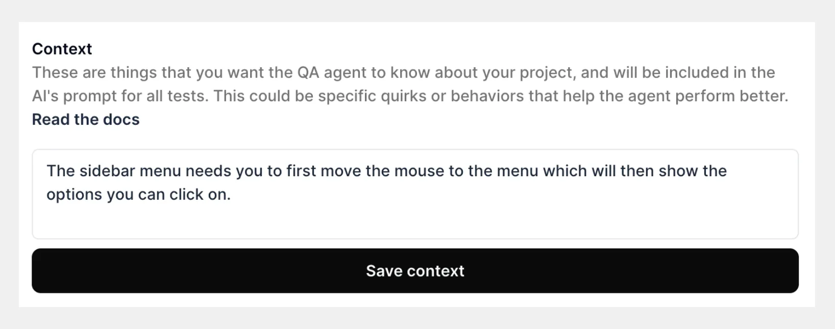 - Centralized Information: Define project-specific details that the AI agent should consider during testing.
