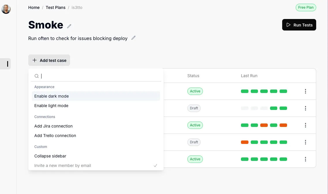 Test Plans are collections of test cases that you want to run together regularly. This feature provides flexibility in running tests through multiple methods: API triggers, scheduled runs, or manual execution through the UI.